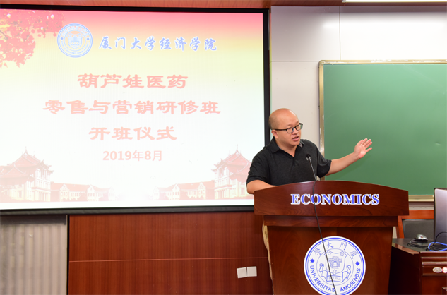 在开班仪式上,廖景峰主任首先代表厦门大学经济学院热烈欢迎金沙城医药零售与营销研修班的学员到厦大学习,并就厦门大学及经济学院的相关情况进行了介绍。他说,金沙城学员走进厦大就是厦大的校友,希望未来的日子能够关心、支持母校的发展,多提宝贵意见,同时他也祝大家在厦大学习期间学有所成、学有所获。